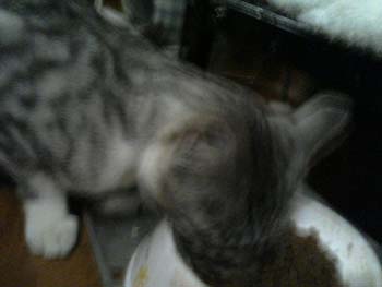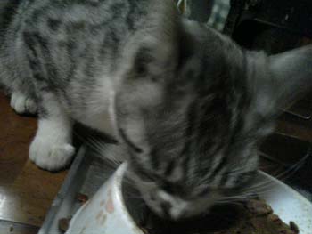 食事風景を撮ろうと思い「アキちゃん、はいチ~ズ!」と言った瞬間、レンが甘えて頭突きしてきたのでブレた。甘えるのはいいが頭突きはやめー!