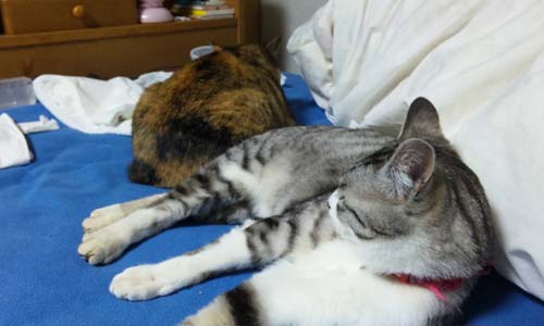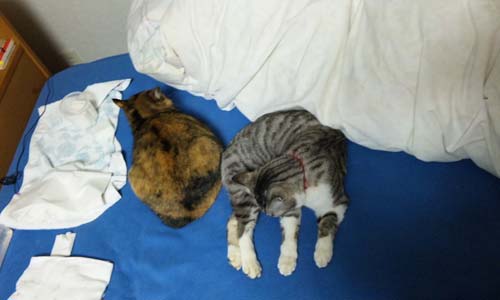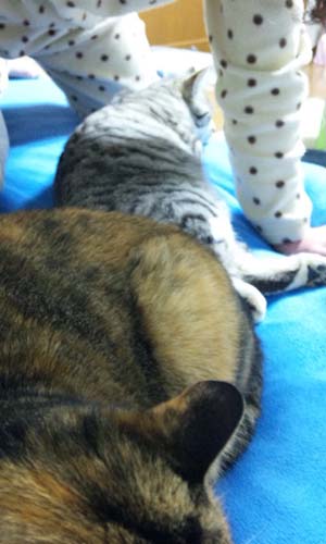 気を取り直して折りたたみに昨夜寝る前のニャンニャン達。シマネコとデブネコに睡眠を妨害される水玉妖怪(神凪)の巻。