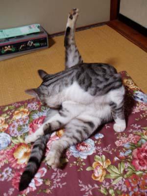 今はなきムスコに思いを馳せ…ているかどうかは知りませんが大事な所をキレイにするのはとてもいい事よ!それにしても開脚し過ぎなんじゃないかね、アキラくん!?ママ今までこんなに堂々と足開く猫飼った事ないよ!もっと恥らいなさい!(全裸がノーマルスタイルな人間の言うセリフではない)