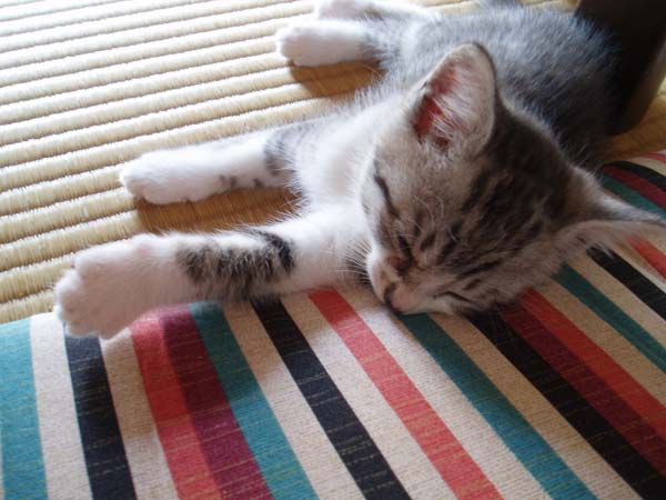 アキラはどこでも寝ます。この前はテーブルに置いてあった麦茶の入れ物の横に座ったままウトウトしていてビックリした。麦茶の容器だと思って掴む所だったよ!