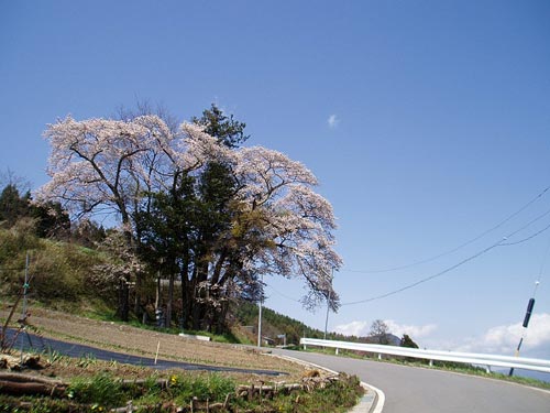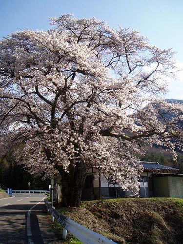 大きな桜の木。右は夜間ライトアップされた時の画像。ライトアップは地元でも少人数しか知らないので密かに毎年楽しみだったり。