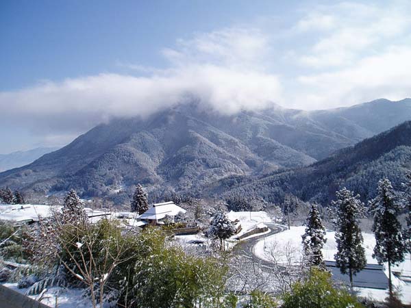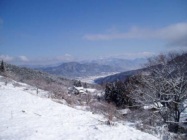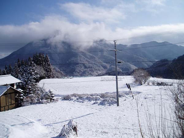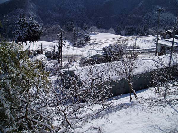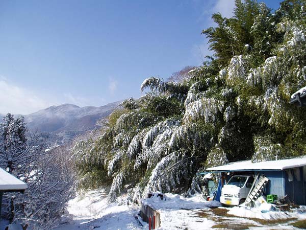 家の前から撮った風景。雪の重さで竹が折れそう!