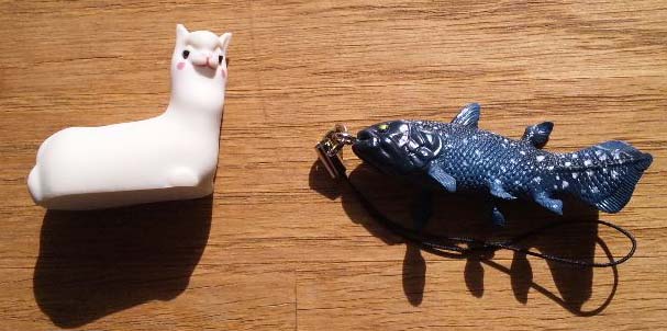 写真は後日家で撮ったものですがこんなん出ました。シーラカンスはストラップでアルパカさんはメモ立て。…使ってやる!