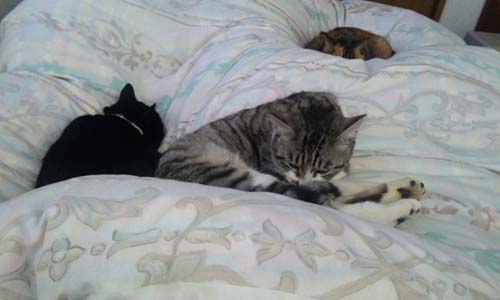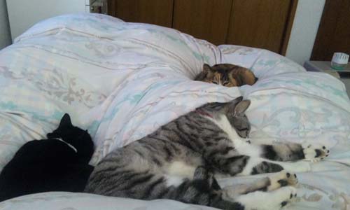 ちなみにいうと無人の布団に猫が集まっていた訳ではなく、ちゃんと神凪が寝ている状態でこの有様だったのでアキラが腹の上に乗り左脇をレンに固められ股下をチビに陣取られるという猫地獄。