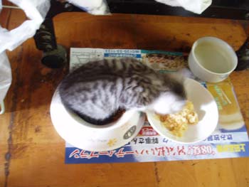 キャットフードの入ったエサ皿に入って納豆御飯をお召し上がりになられているニャキラ様。