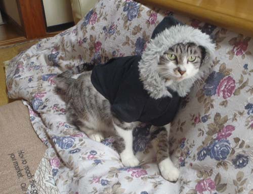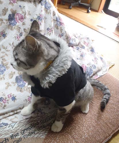 あまりに寒かったので先日マッチョ映画見に行った時にカイ●ズホ●ムで買っちゃった犬用のパーカーをアキラに着せてみたぜ!